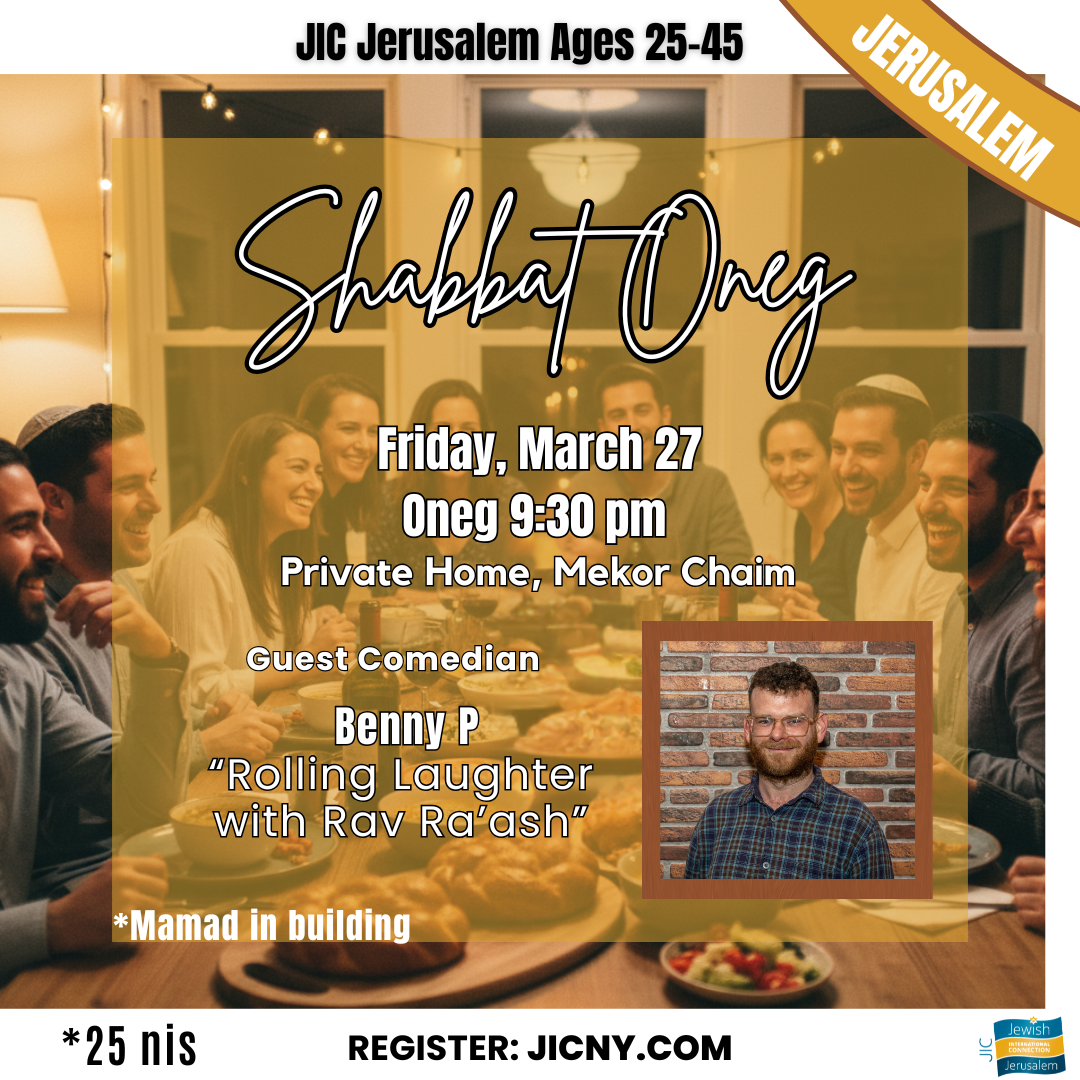 Enjoy a special comedy set by guest comedian Benny P, bringing you “Rolling Laughter with Rav Ra’ash” — the perfect way to end your Shabbat on a high note.