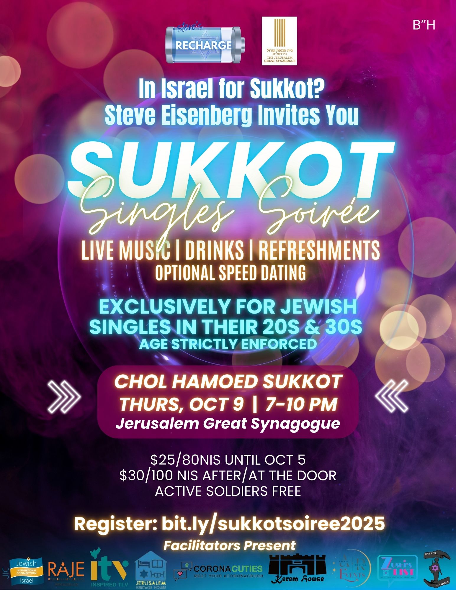 Join Steve Eisenberg (JIC Co-founder) for a fun evening on Chol Hamoed Sukkot with live music, drinks, refreshments and optional speed dating!
