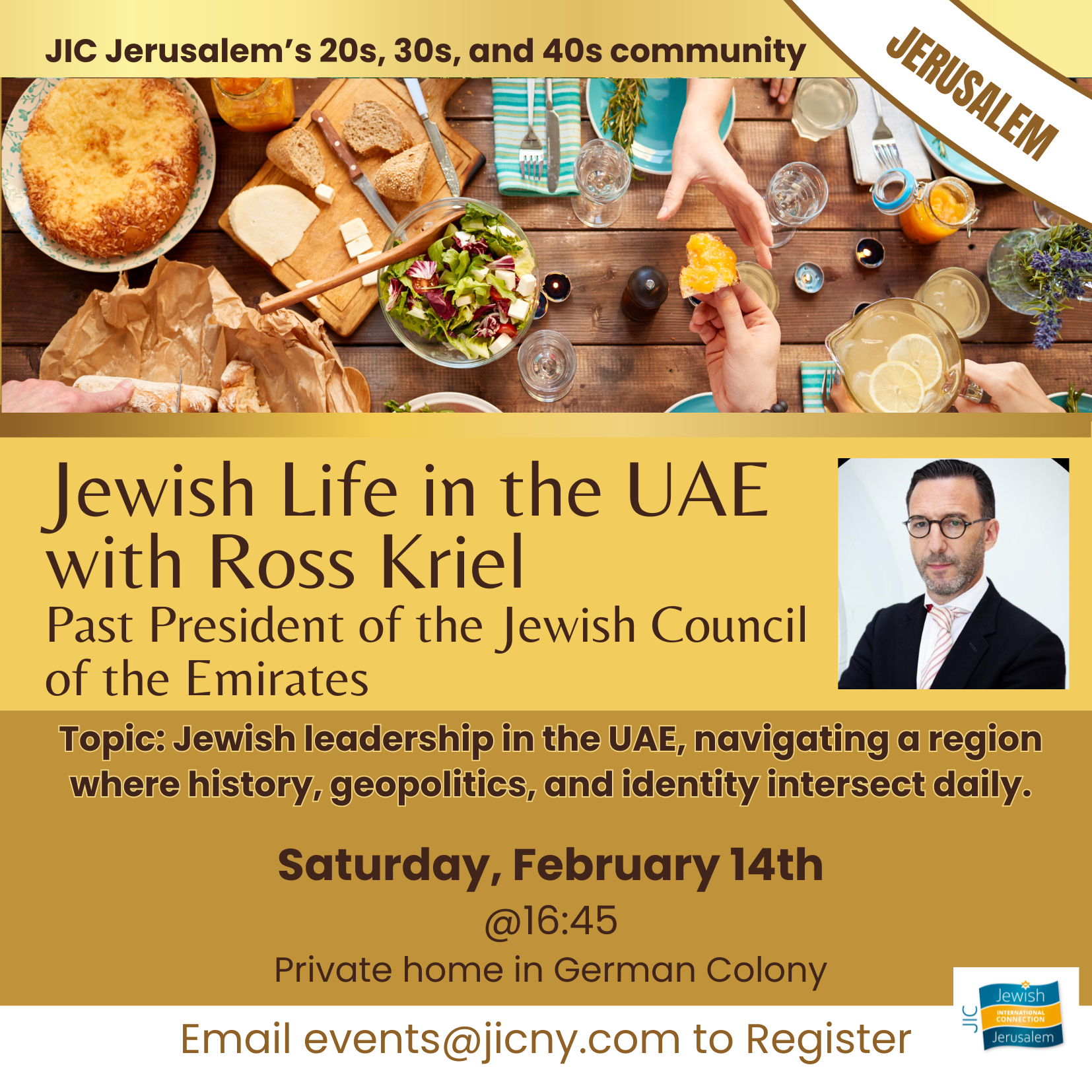 Join JIC Jerusalem for an intimate and fascinating conversation with* Ross Kriel, Past President of the Jewish Council of the Emirates*, as he shares what Jewish life looks like in the UAE today.