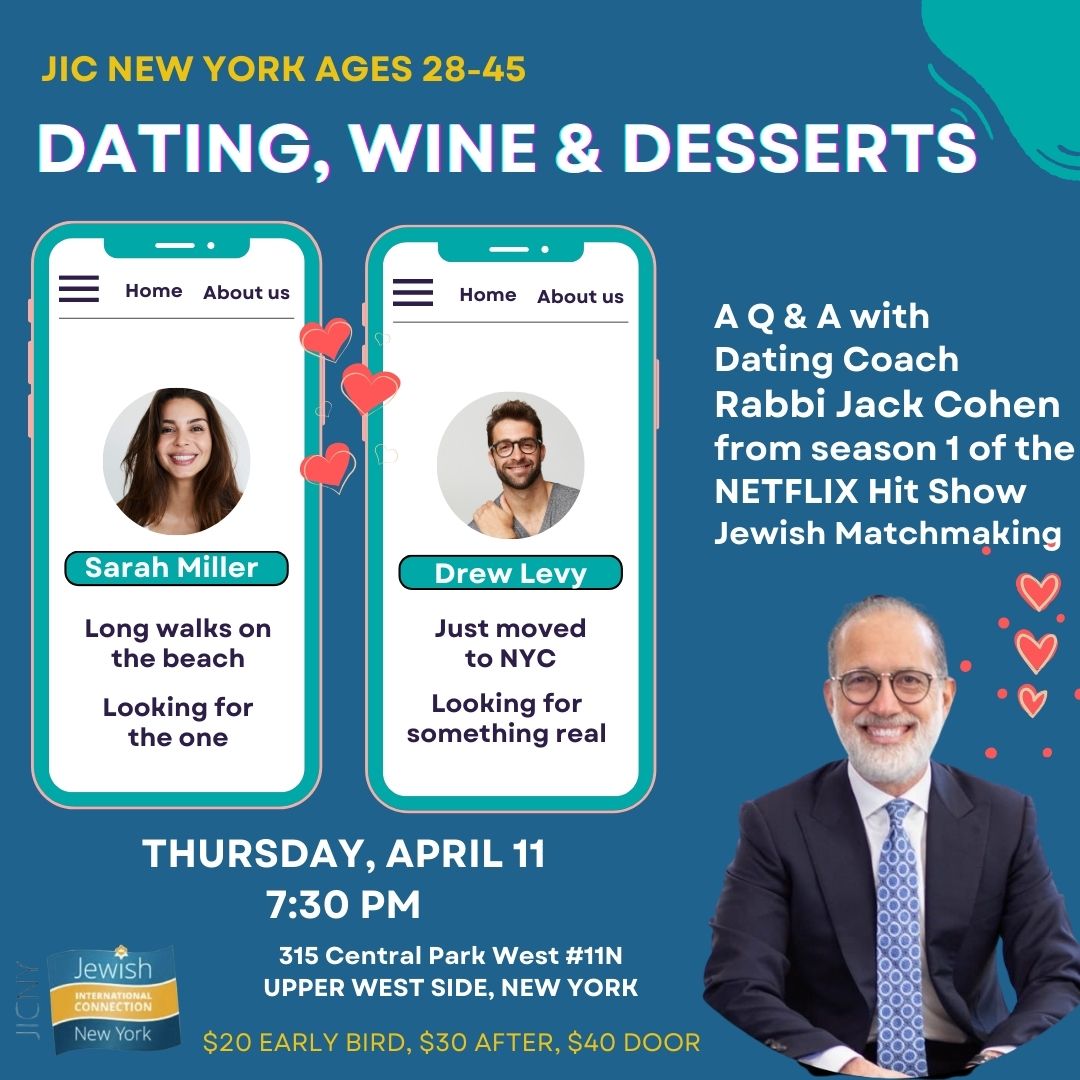 Plus enjoy dessert & wine while mingling and meeting new young jewish professionals ages 28-45.